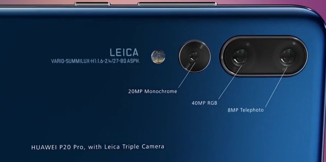 P20 Pro的后置相机从上到下依次是800w像素光变镜头、4000w像素彩色镜头、2000w像素黑白镜头。