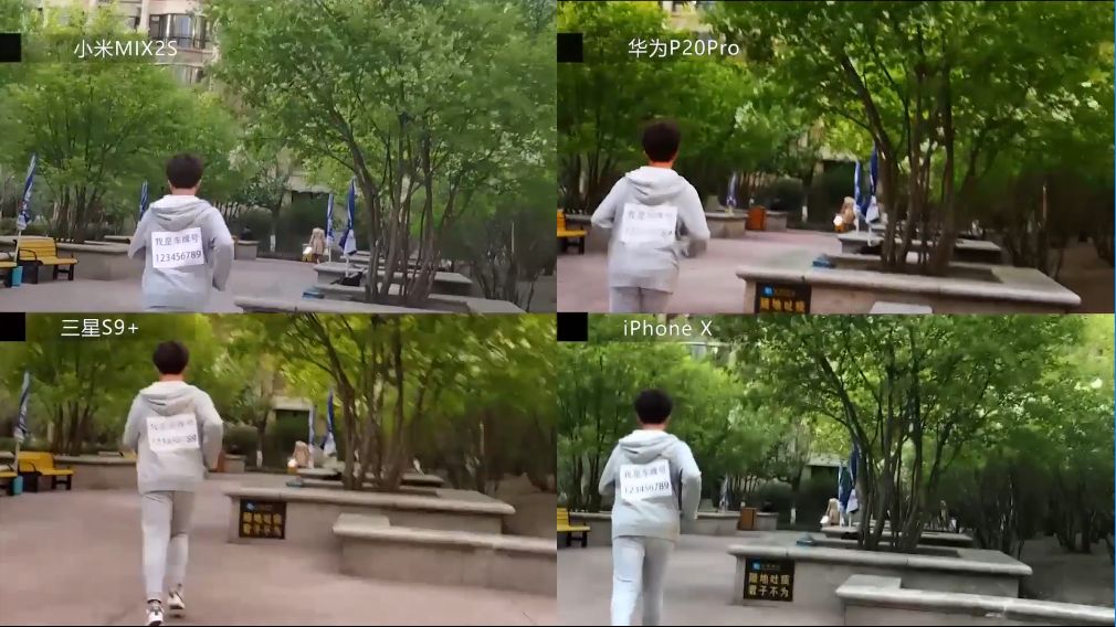 白天的时候4台机器的防抖效果比较均衡,iPhone X在定点定频抖动的场景有所落后。在跑动过程中的拍摄移动的物体,MIX 2S全场最佳,在4台机器的画面显示中数字最清晰。