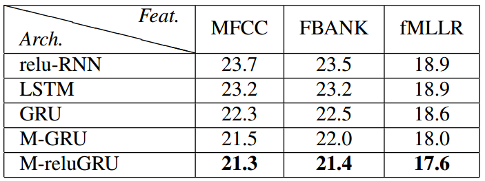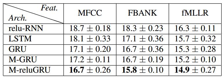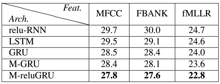 表 3:各种 RNN 架构在 DIRHA English WSJ 数据集(仿真的部分)上所得到的词错率(%)