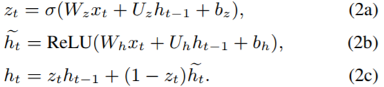 移除重置门并且使用 ReLU 激活函数替代 tanh 后,我们可以得到新的公式:
