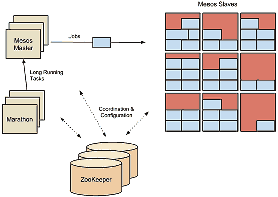 Marathon 负责启动、监视并扩展容器。Mesos master 将分配给节点的任务发送给 Marathon,并在节点具有一些可用的 CPU/RAM 时向 Marathon 提出要约。Mesos slaves 负责运行容器并提交自身可用资源的列表。