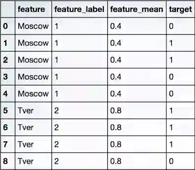 其中,featurelabel是scikit-learn编码的标签,featuremean就是莫斯科标签下的真实目标数量/莫斯科标签下的目标总数,也就是2/5=0.4。