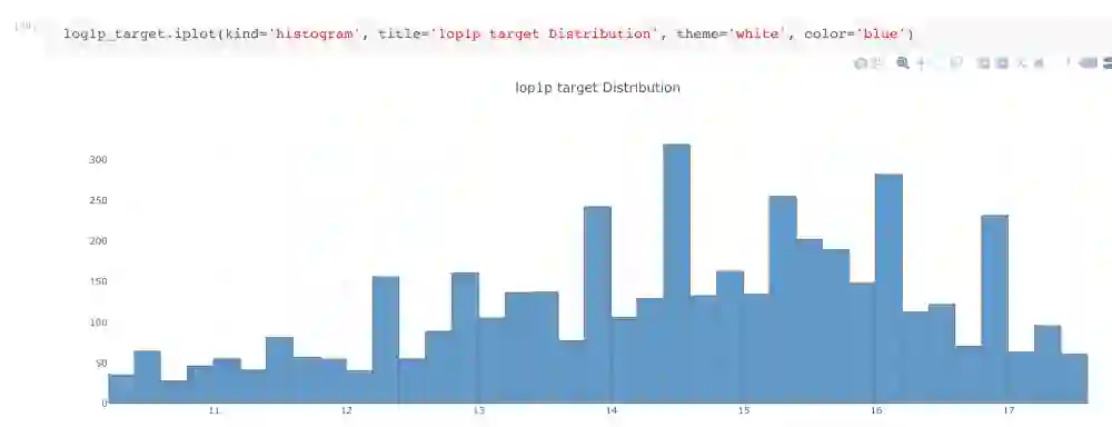 如上图所示,这里的数据高度偏斜,如果我们把目标变量转成log(1+目标)格式,那么它的分布就接近高斯分布了。