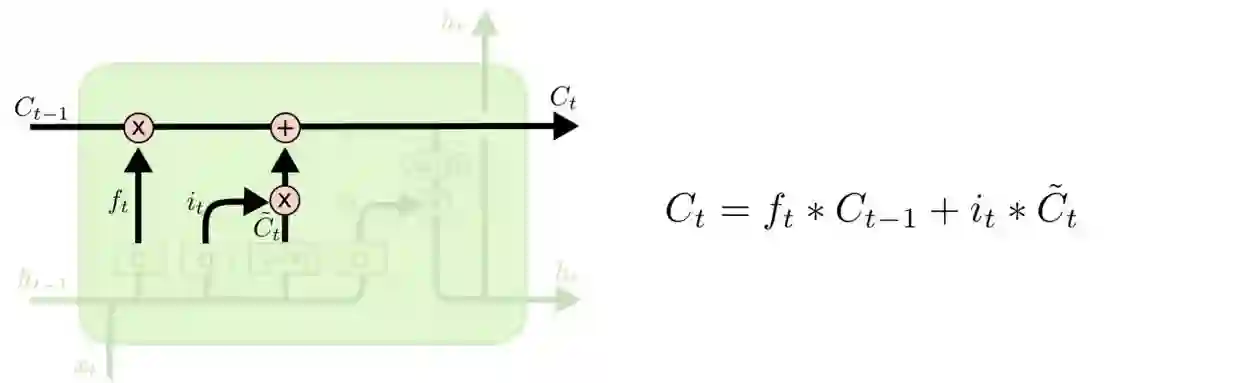 然后我们就可以更新 cell 状态了, 即把Ct−1更新为Ct。 首先我们把旧的状态 Ct−1和ft相乘, 把一些不想保留的信息忘掉。然后加上it∗Ct。这部分信息就是我们要添加的新内容。