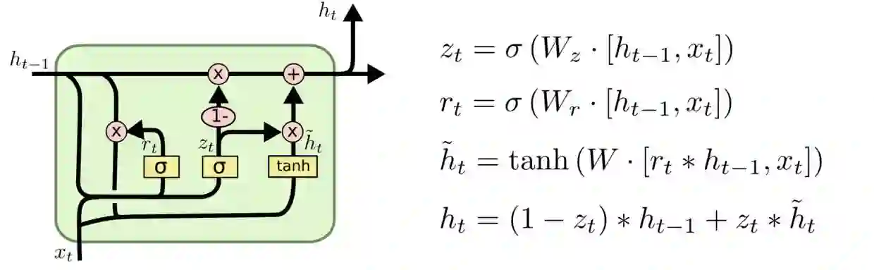 LSTM的一个稍微更显着的变化是由Cho,et al(2014)介绍的门控循环单元——GRU。 它将忘记和输入门组合成一个单一的“更新门”,它还合并了cell状态和隐藏状态,并进行了一些其他更改。所得到的模型比标准LSTM模型更简单,并且越来越受欢迎。