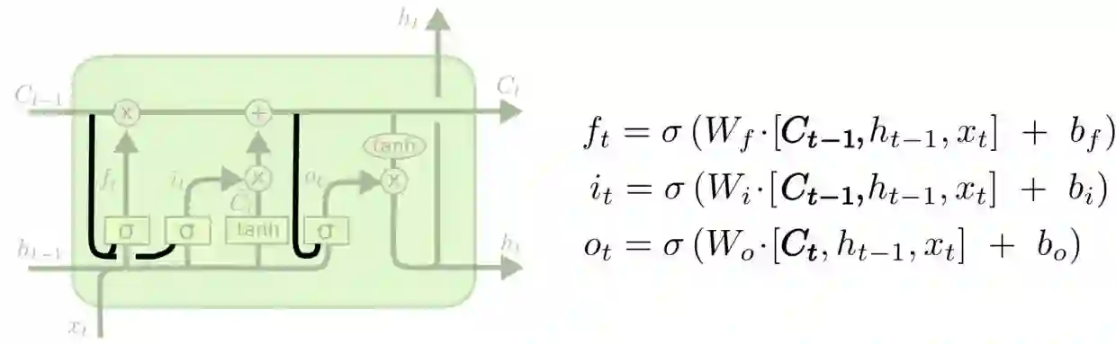 一个受欢迎的LSTM变体是Gers & Schmidhuber (2000)提出来的,他们在里面加入了“peephole connections”。这意味着让门层也会接受cell状态的输入。