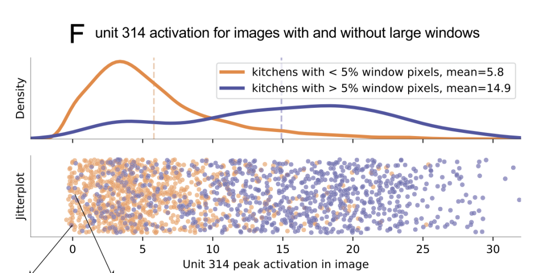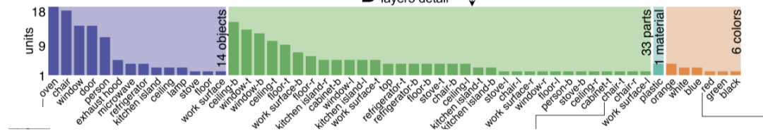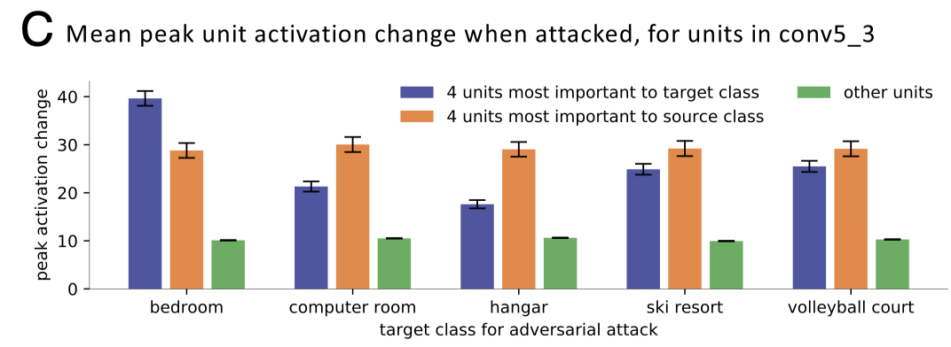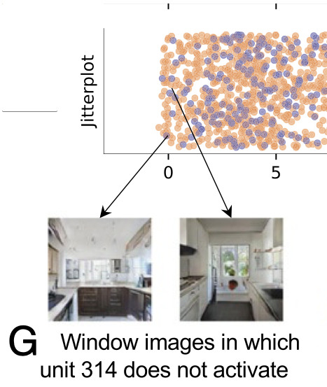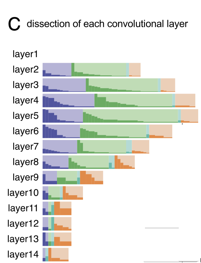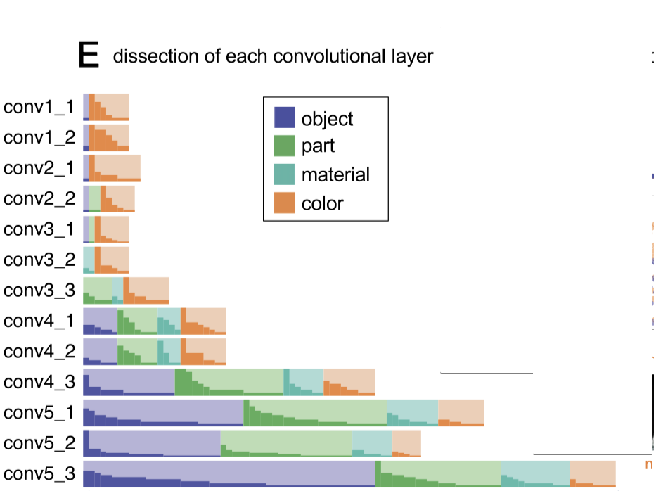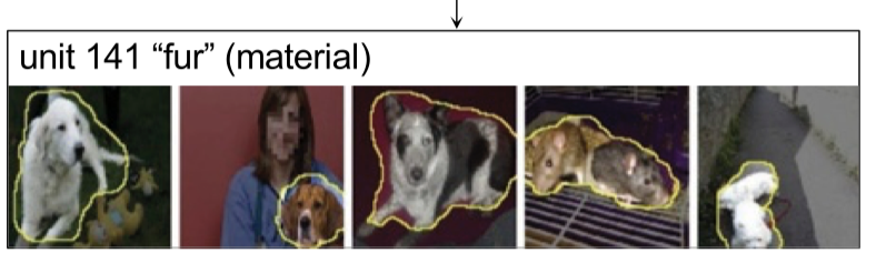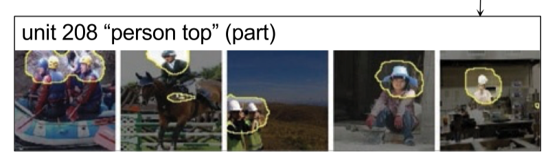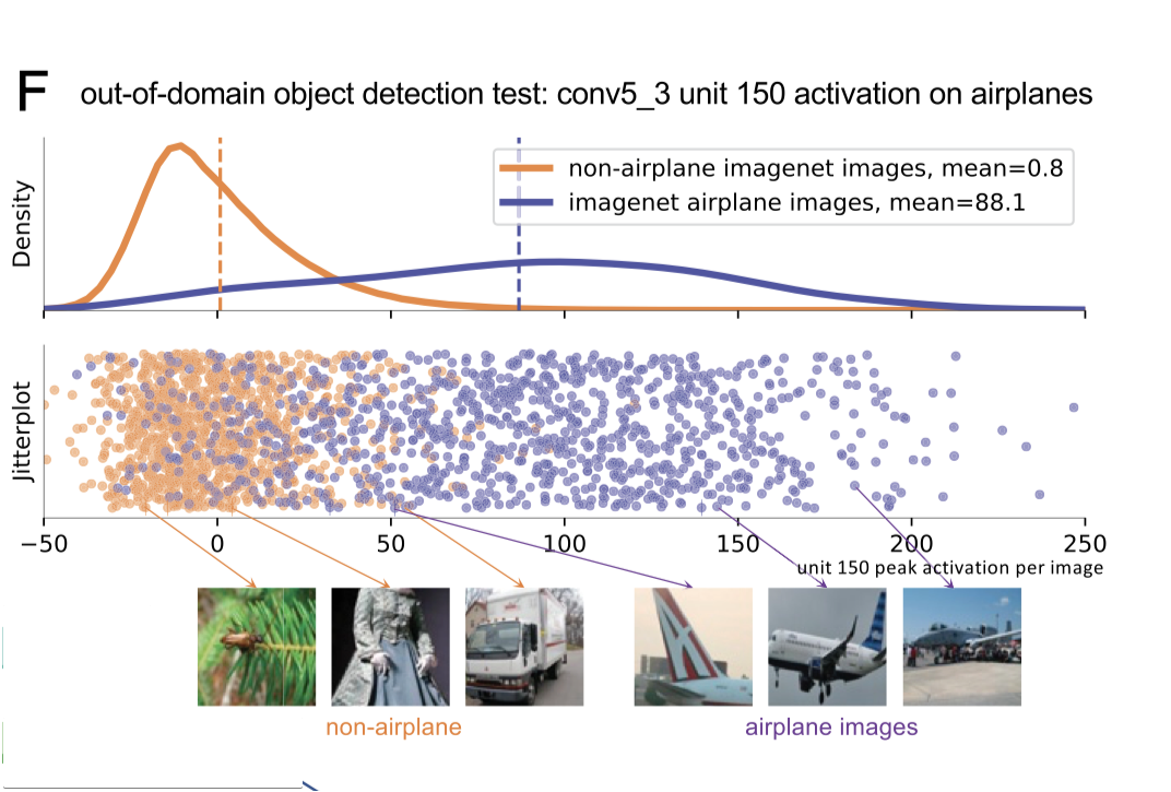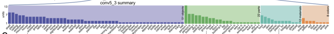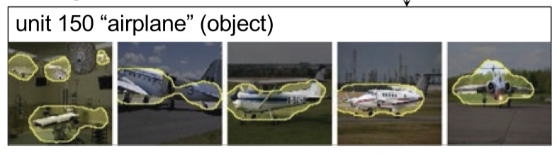 首先,在景色分类任务训练时,研究人员对物体检测器对应的单元进行了定义。具体来说,研究者对VGG-16结构的CNN网络进行了分析,而分类任务则使用了从MIT计算机科学和人工智能实验室风景识别数据库中提取的Places365数据集,将图像分为365个风景类别。研究人员分析了13个卷积层中所包含的所有单元,并将高于阈值(对应于单元u的激活函数的top1%值)的激活区域进行高亮,结果如图下所示:通过上图,我们可以看出,此区域对应于人类的头部。接着,为了定义对应于语义概念的过滤器,研究人员使用了图像分割模型来去衡量每个过滤器和视觉概念c的一致关系,该分割模型可以预测图像x位置p的视觉概念c的存在。为了量化概念c和单元u的对应关系,研究人员使用了IoU(Intersection Over Union)比率:研究人员在支持验证图像集上计算了IoU比率。在验证集上,针对1825个分割概念c(包括物体类别,物体的一部分,材料和颜色),每个单元都有自己的得分。接着,研究人员根据最高得分的匹配概念对单元进行了标注。下面几张图展示了在具有最高单元激活函数值的五张图片中部分具有标签的概念检测单元:飞机(物体):人类头部(物体部分):材料:研究人员将conv5_3对应于每个分割概念的单元罗列了出来(不包括IoU比率 < 4%的单元),这个结果可以展示对应于每个语义概念的单元的出现频率:在不同卷积层中,最后一层具有最大数量可以被单元检测出的物体类别,然而,检测物体部分的单元数量在之前(conv5_1)就达到了峰值:很有趣的是,即使在训练的时候并没有标记,物体检测器依然出现了。下图展示了单元150(对应于物体飞机)在飞机和非飞机样本图像上的活跃度:
