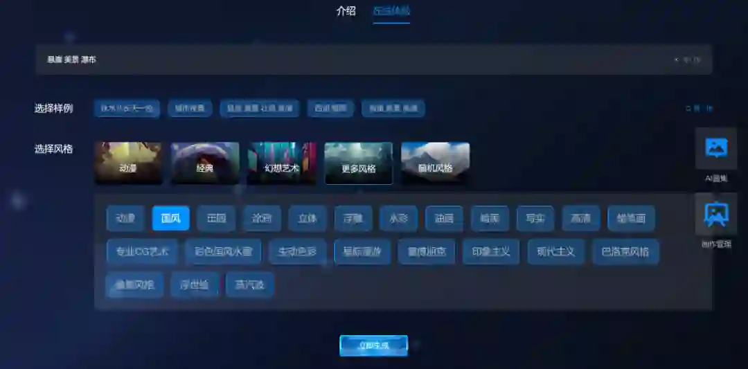 这次平台升级后,首次开放AI画廊模块,用户只要点击“AI画集”按钮,就可以查看海量开发者基于悟空.画画生成的图片,小编再也不用头(花)疼(钱)为排版文章找图片了: