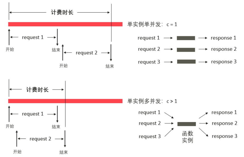 单实例最大并发度 (Maximum Requests per Instance):函数的单个实例可以同时处理的最大请求数,主要适用于函数执行过程中有显著时间在等待下游服务返回的场景,如访问数据库操作或磁盘 IO 等。对于相同的流量负载,提高函数的单实例并发度可以降低按量实例个数,为用户节省计费,同时,也可以降低函数调用请求的冷启动比例。
