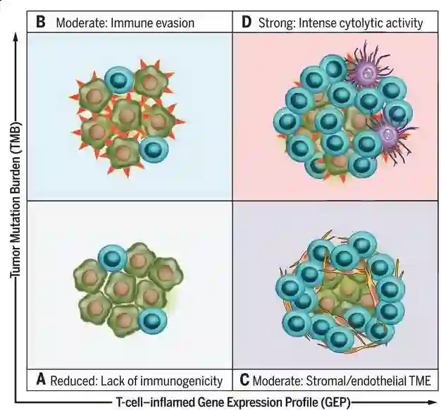 肿瘤突变负荷(TMB)和炎性T细胞基因表达谱(GEP)在辨别针对PD-1抗体派姆单抗的应答者和非应答者方面展示出联合预测效用。