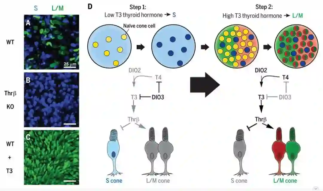 类器官和视网膜拥有相似的分布、表达谱和锥体亚型结构。S锥体首先被指定出来,然后是L/M锥体,而甲状腺激素信号控制了这一顺序开关。