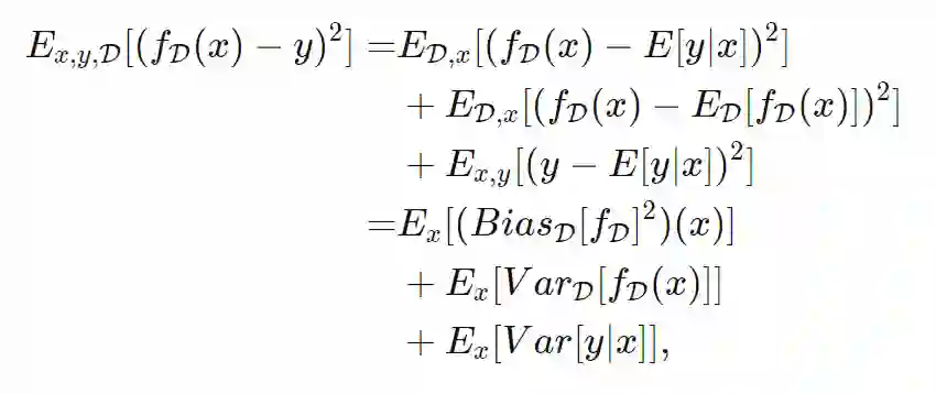 并利用 (x,y) 和D的独立性,我们可以将预测的期望平方误差分解为: