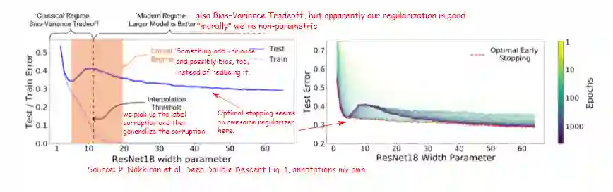 所以看起来现代神经网络本质上是非参数的,其工作方式依赖于各种正则化。为了使用M. Belkin等人的公式,我们希望更加了解,我们对于各种技术如何对某些函数空间范数作用的理解到了什么程度。似乎很难得出“传统”统计数据表明现代学习不起作用的结论。