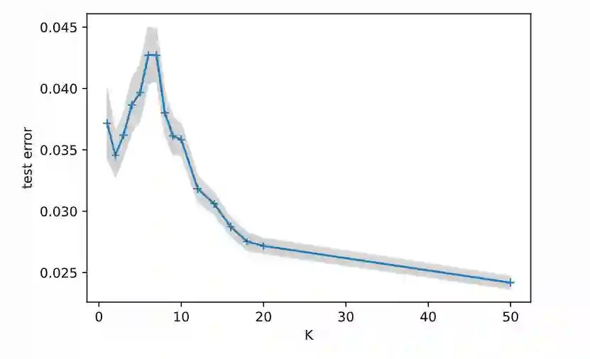 如果我们以不同的K值运行200次,并记录其准确性,我们可以看到双重下降中的凹凸: