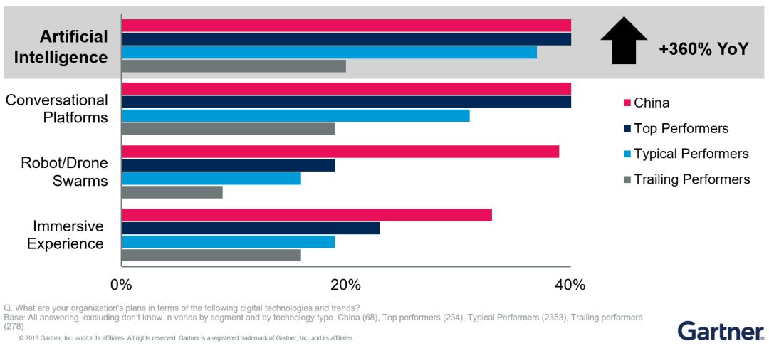 Gartner针对这些首席信息官的具体投资项目以及他们将在数字化转型中部署的新兴技术类型也进行了调查。虽然在当前数字环境下,网络安全毫无意外地排在了第一位,但最大的惊喜在于人工智能技术。在2018年,只有16%的首席信息官愿意对人工智能技术进行投资。在短短一年时间内,这一比例增长了3.5倍以上。原因在于人工智能项目中一些早期且高调的成功案例十分引人注目,而国家级项目则是另一部分原因。综合以上因素,在运用创新技术方面,中国的首席信息官比全球同行更加乐观。