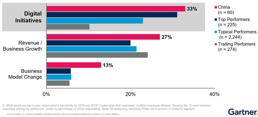 数字化业务是每位IT领导者的首要议题。Gartner 2019年首席信息官议程调查结果显示,中国IT领导者将数字项目(Digital Initiatives)列为工作的重中之重。事实上,这在全球范围内也是如此,但中国超过了全球其他卓越首席信息官对于数字化计划的重视程度。这充分表明中国的首席信息官真正接受了数字化业务并已将其列为头等工作事项。