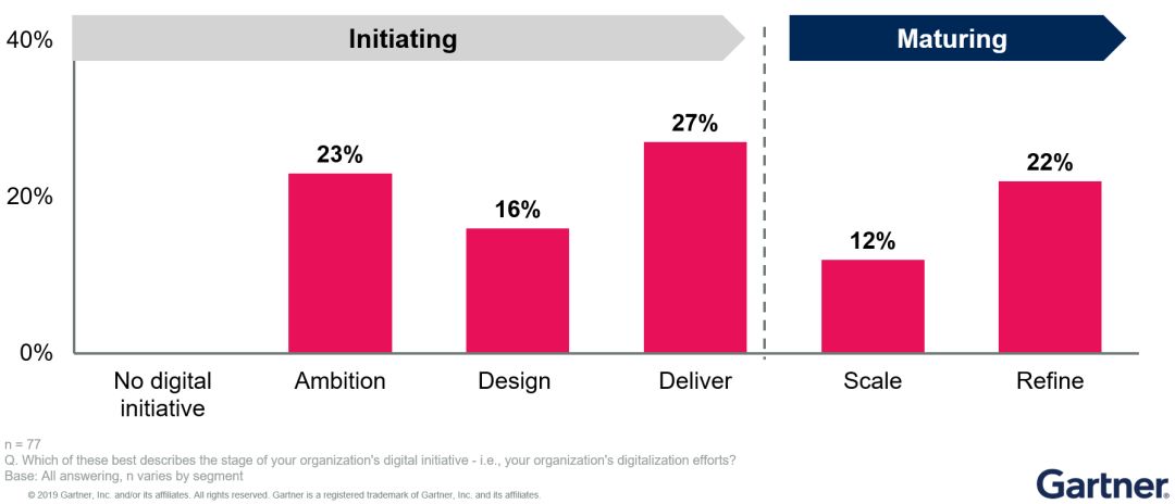 在成熟度方面,Gartner发现三分之一的中国企业机构已经拥有“成熟的数字化”。“数字化成熟”的企业机构的首席信息官能够提供更大的容量(处理能力)、规模(面向消费者的服务种类)以及敏捷性(快速变化的能力),且一直积极拓展其数字化业务。此外,超过五分之二(22%)的中国企业已更进一步,开始细化其数字化业务,并寻找新的机会。无论身处何种行业,这些新机会都会引来中国数字颠覆者的注意。而拥有数字化业务的企业也更加开放,已将颠覆者视作可为整个行业创造价值的合作伙伴或代理人。