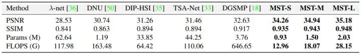 先验货,MST 与 MST++ 与 SOTA 方法对比如图1所示,很轴为计算量,纵轴为性能,圆半径代表参数量。MST 与 MST++ 占据了左上角,参数量也非常小,实现多快好省的高光谱图像重建。