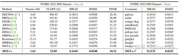 定量对比: MST++ 与其他 SOTA 方法在 NTIRE 2022 的 validation 和 test 数据集上的对比如表3所示。我们的MST++ 依旧使用更少的计算量和参数量,达到了更高的性能指标,同时取得了 NTIRE 2022 Challenge on Spectral Reconstruction from RGB 的冠军。