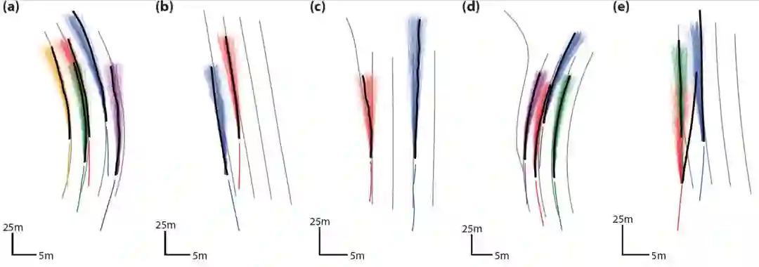 马萨诸塞州驾驶数据集的定性实验结果样例如上所示。每辆车的过去轨迹以不同的颜色显示,其后连接的是网络对这些车未来轨迹的预测的采样。正确结果(Ground Truth)的轨迹以黑色显示,车道中心以灰色显示。