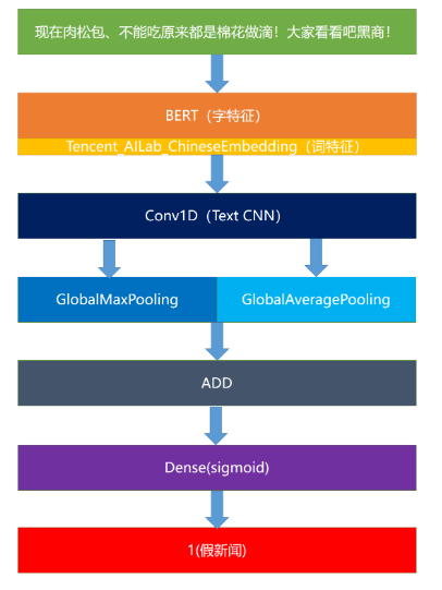 该模型采用BERT模型提取出字向量(不Finetune),然后结合腾讯词向量,作为最终的词向量输入到1维卷积网络中。在池化过程中同时选择最大池化和平均池化,最后将其结果相加,接入一个Dense层中得到结果。