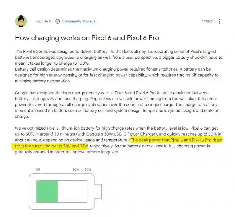 注意,谷歌还使了个小心眼:Pixel 6 / 6 Pro 均不支持 30W 快充。官方后来承认,Pixel 6 / 6 Pro 最高仅支持 21W / 23W 充电。用户如果要选购第三方充电器,也得留个神——Pixel 6 系列使用 USB PD 的 PPS 协议,非三星手机很少使用。
