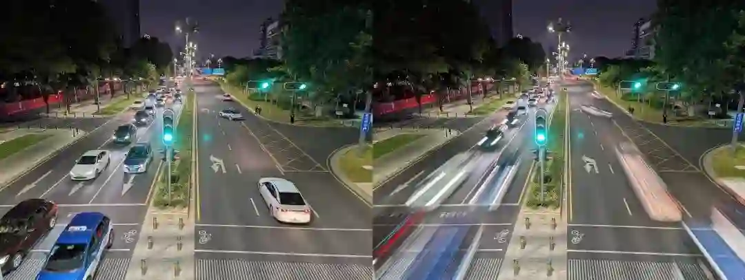 比如下面这组 Pixel 6 Pro 和 Pixel 4 XL 夜视模式对比样张,第二张图中 Pixel 4 XL 的色彩可能更讨喜一些,但当时的实际情况更接近第一张图,树叶在灯光下是更偏黄色的。