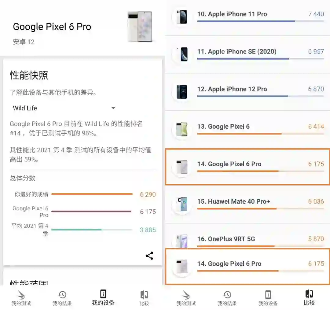 GPU 性能为它扳回了一城。Pixel 6 Pro 的 Tensor 芯片集成 20 核 Mali-G78 GPU,规格上直逼 24 核 G78 的麒麟 9000。Pixel 6 Pro 3DMark WildLife 跑分达到 6175 分,安卓阵营几无敌手;GFXBench 的曼哈顿 3.1 离屏测试,Pixel 6 Pro 跑出了 112fps,接近骁龙 888 水平。