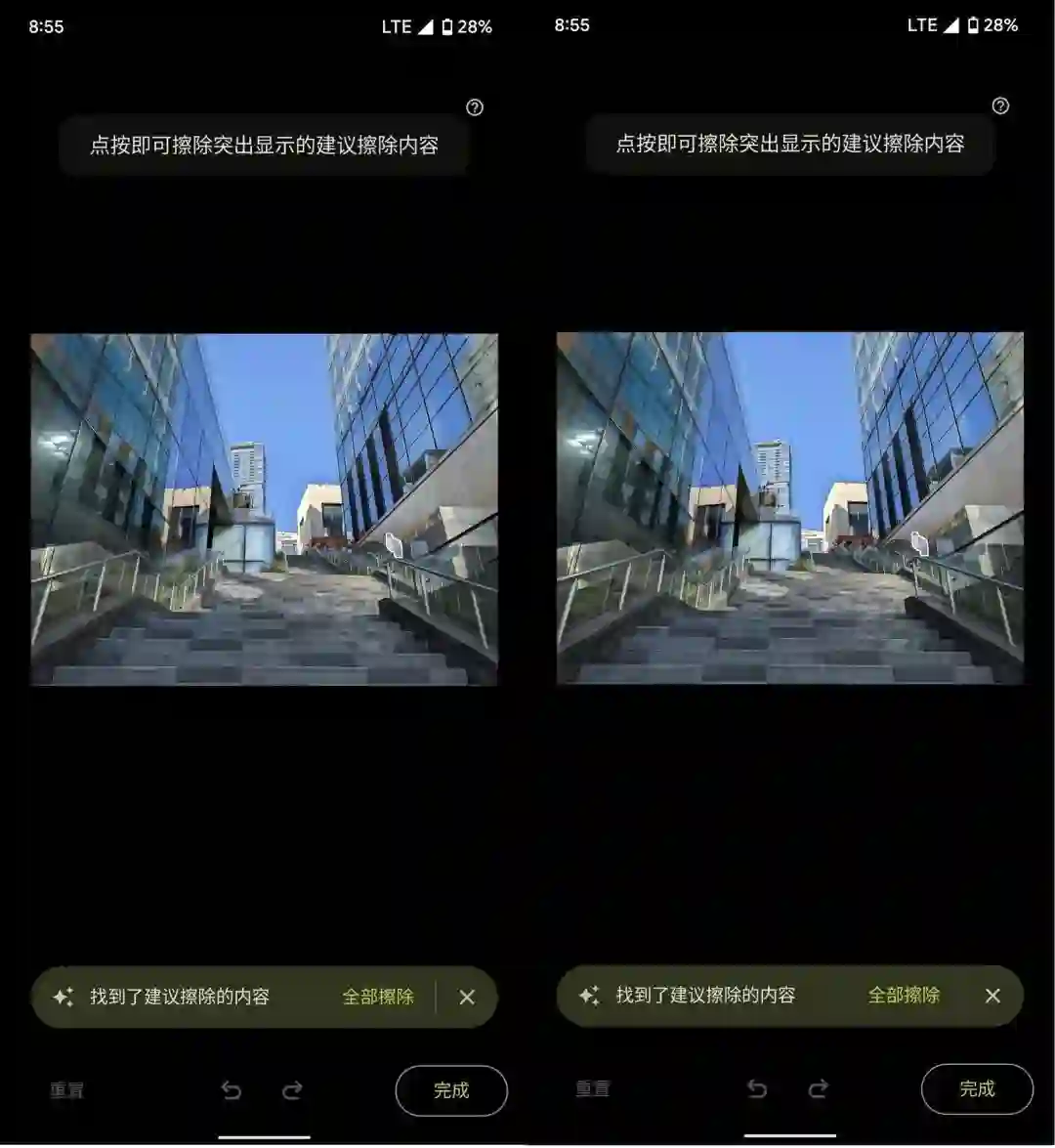 Pixel 6 Pro 还引入了一些方便趣味的小工具,比如橡皮擦和运动模式。橡皮擦功能可以自动或手动消除画面中的对象,比如抢镜的人或物等,效果不能说以假乱真,至少不放大是能凑合用的。