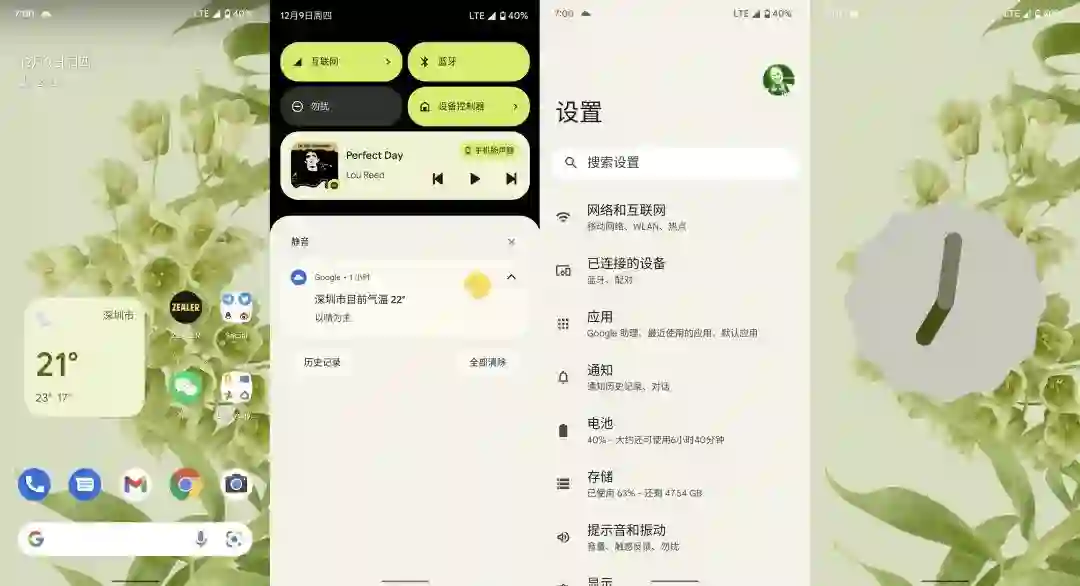 我们在此前的 Android 12 上手文章中聊过了详细体验,当时使用的是 Pixel 4 XL,体验上与 Pixel 6 Pro 差别不大,这里便不再赘述。Android 12 主要带来了全新 Material You 设计,拥有从壁纸取色的全局主题色引擎,系统元素全面圆角化,小组件迎来新设计,并推出了隐私信息中心、麦克风和相机调用指示器、游戏模式和滚动长截图等功能。