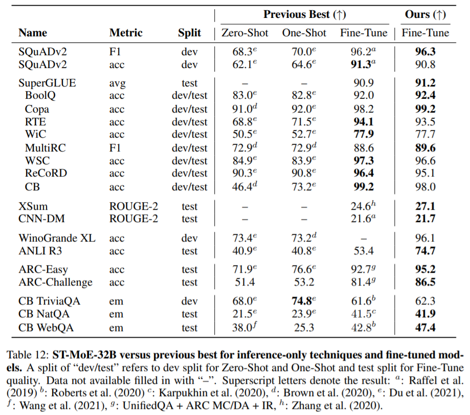 这篇论文的目的就是提高稀疏模型的实用性和可靠性。他们研究了这两个问题,并给出了设计指南。最后,他们将稀疏模型的参数缩放到 269B,其计算成本与 32B 密集编码器 - 解码器 Transformer(稳定、可迁移的 Mixture-of-Experts、ST-MoE-32B)相当。这是稀疏模型首次在迁移学习中实现 SOTA 性能,跨越了一系列不同的任务,包括推理(SuperGLUE、ARC Easy、ARC Challenge)、摘要(XSum、CNN-DM)、闭卷问答(WebQA、Natural Questions)和对抗式构造任务(Winogrande、ANLI R3)。
