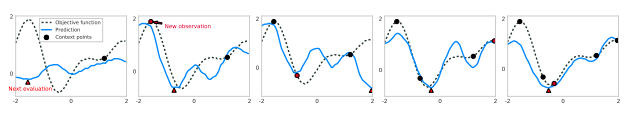 这些图展示了5次迭代优化的过程。每个预测函数(蓝色)是通过对一个潜变量(latent variable)的采样来绘制的,其中该变量的条件是增加文本节点(黑色)的数量。底层的ground truth函数被表示为一条黑色虚线。红色三角形表示下一个评估点(evaluation point),它对应于抽取的NP曲线的最小值。下一个迭代中的红色圆圈对应于这个评估点,它的底层ground truth指将作为NP的一个新文本节点。