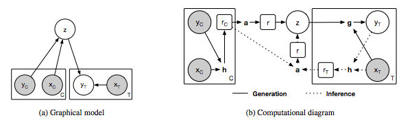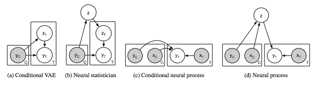 (a)neural process的图模型,x和y分别对应于y = f(x)的数据,C和T分别表示上下文点和目标点的个数,z表示全局潜变量。灰色背景表示观察到变量。