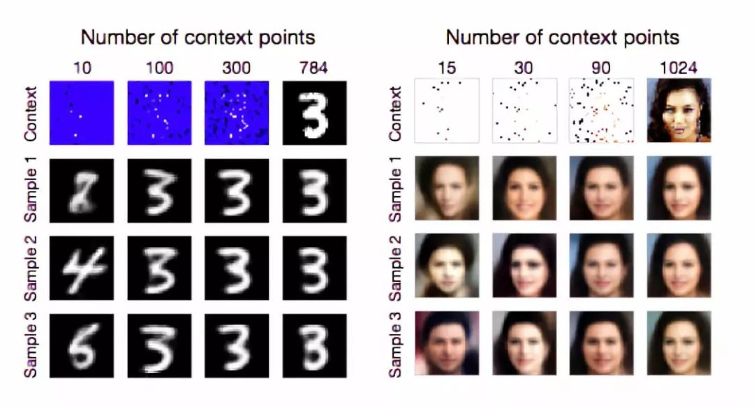 左边的图展示了一张图像完成像素化可以框定为一个2-D回归任务,其中f(像素坐标)=像素亮度。右边的图展示了图像实现MNIST和CelebA的结果。顶部的图像对应提供给模型的上下文节点。为了能够更清晰的展现,未被观察到的点在MNIST和CelebA中分别标记为蓝色和白色。在给定文本节点的情况下,每一行对应一个不同的样本。随着文本节点的增加,预测像素越来越接近底层像素,且样本间的方差逐渐减小。