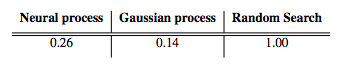 优化步骤的平均数需要达到高斯过程生成的1-D函数的全局最小值。这些值是通过随机搜索采取步骤数来标准化的。使用恰当的核(kernel)的高斯过程的性能等同于性能的上限。