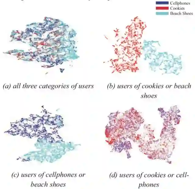 图4是用户兴趣理解模块的可视化结果,我们分析的是对手机、饼干、沙滩鞋感兴趣的三类用户。可以看出,对三类用户同时做可视化,兴趣理解模块的区分度并不显著,但如果只区分两类用户的话,兴趣理解模块可以做出不错的区分。这也符合常理,人在挑选多样物品的时候,也容易“挑花眼”,但如果只是从两件物品中选一件,一般来说更容易做出较好的选择。