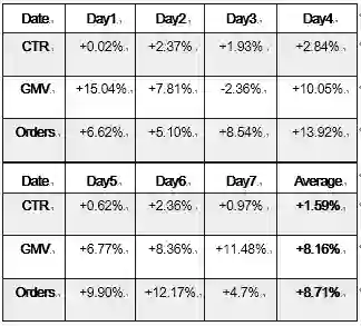 作为一项以应用为目标的基础研究成果,Telepath在京东的诸多场景都有落地,在推荐、广告等实际业务中都发挥了作用。表1和表2分别展示了Telepath在一个京东App推荐位和一个京东广告合作媒体上线的效果,可以看出,在这两种场景下,点击率(CTR)和GMV都有显著的效果提升。