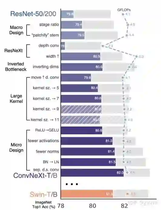 ConvNeXt 采用标准神经网络 ResNet-50 并对其进行现代化改造,以使设计更接近ViT,使用 AdamW 优化器,使用更多 epoch 对其进行训练,应用花式数据增强技术和正则化(高斯误差线性单元GELU代替Relu),使用大卷积核和Inverse Bottleneck(中间粗两头细)。