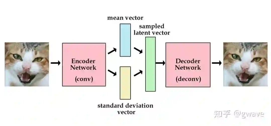 2013年出现的VAE(Variational Autoencoder)[8]恐怕是最著名的生成式模型(Generative Model)了,VAE和AE的差异在于VAE学到的是隐空间的概率分布,然后再对该概率分布进行采样,生成输出,比AE多了学习概率分布参数这一步。
