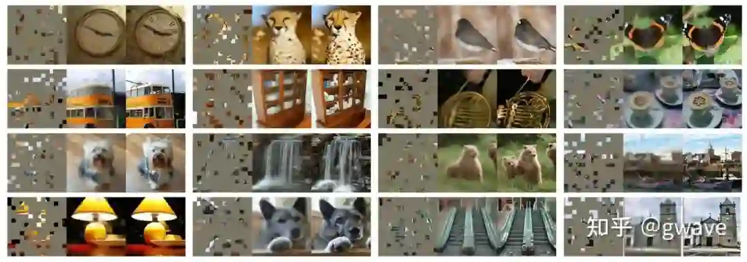 2021年底,kaiming大神的MAE[9](Masked Autoencoder)来了,和VAE一样,MAE是个生成模型,它的Encoder和Decoder是不对称的。所谓Masked就是“掩盖”,上图80%的patch都被盖住 (左),MAE还原的效果(中)和ground truth(右)的对比。感觉比我厉害多了,我很难看出原来的被盖住图像是啥。
