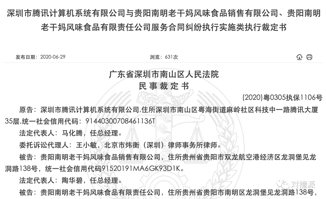 此事系老干妈在腾讯投放了千万元市场合作,但无视合同长期拖欠未支付,腾讯被迫依法起诉,申请资产保全,法院裁定冻结对方企业账户。