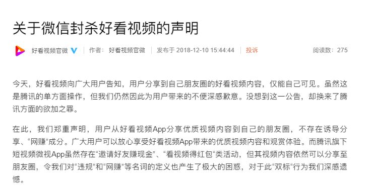 对此,好看视频官微发布声明否认存在诱导分享、“网赚”成分,同时质疑腾讯采用“双标”,认为腾讯旗下短视频微视App就存在“邀请好友赚现金”、“看视频得红包”类活动,但却可以分享到朋友圈。