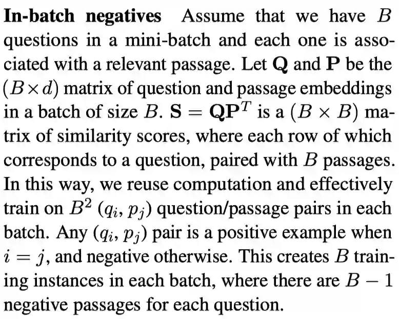 question 和 passage 在 encoding 之后,作者还采用了一种节省计算量的方法,称之为 In-batch negatives,原文描述如下: