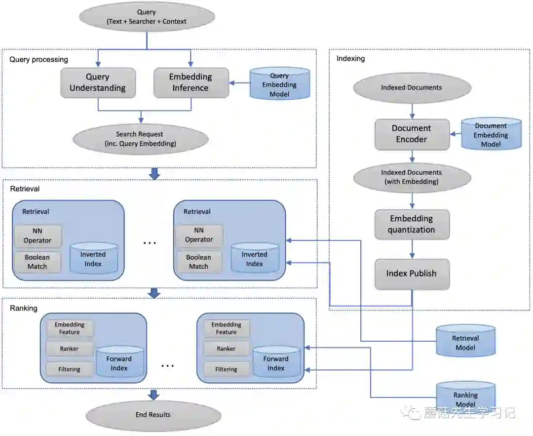左上角是查询处理模块,是双塔模型中的query-side embedding model