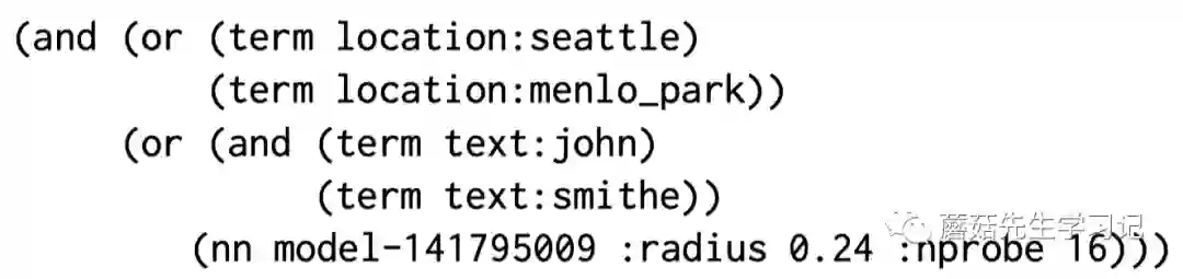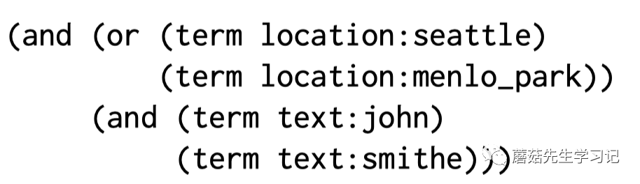 query侧:定义 Term-level 的布尔表达式来表示query。举例:下述query主要返回doc的文本中有john和smithe字眼,并住在seattle和menlo_park的用户。