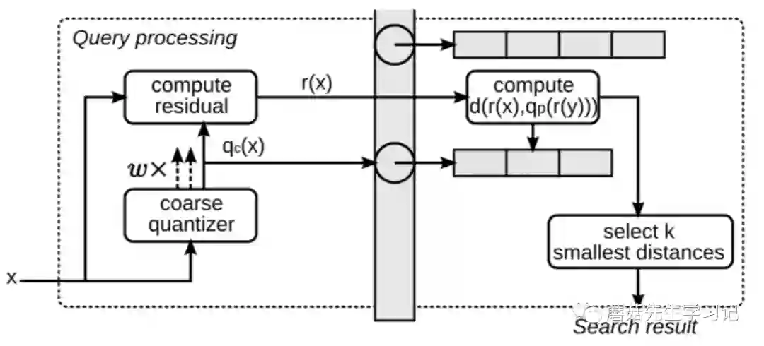 通过粗糙量化器来量化查询向量x,即:找到离x最近的w个粗糙聚类簇。实际上是用于限定搜索的范围,只搜索w个粗糙聚类簇ID索引下的向量。w是个超参数,即nprobes,量化的结果对应term 1。