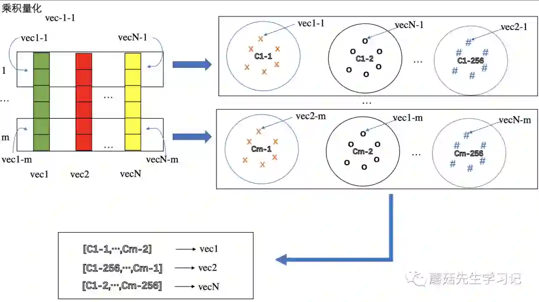 分块量化也可以采取聚类量化来实现,则分块聚类中心的个数即为分块codebook的大小。相当于在这个方法下,对每个向量,有【m个分块向量】来量化它,即:【m个分块聚类中心向量】。示意图如下: