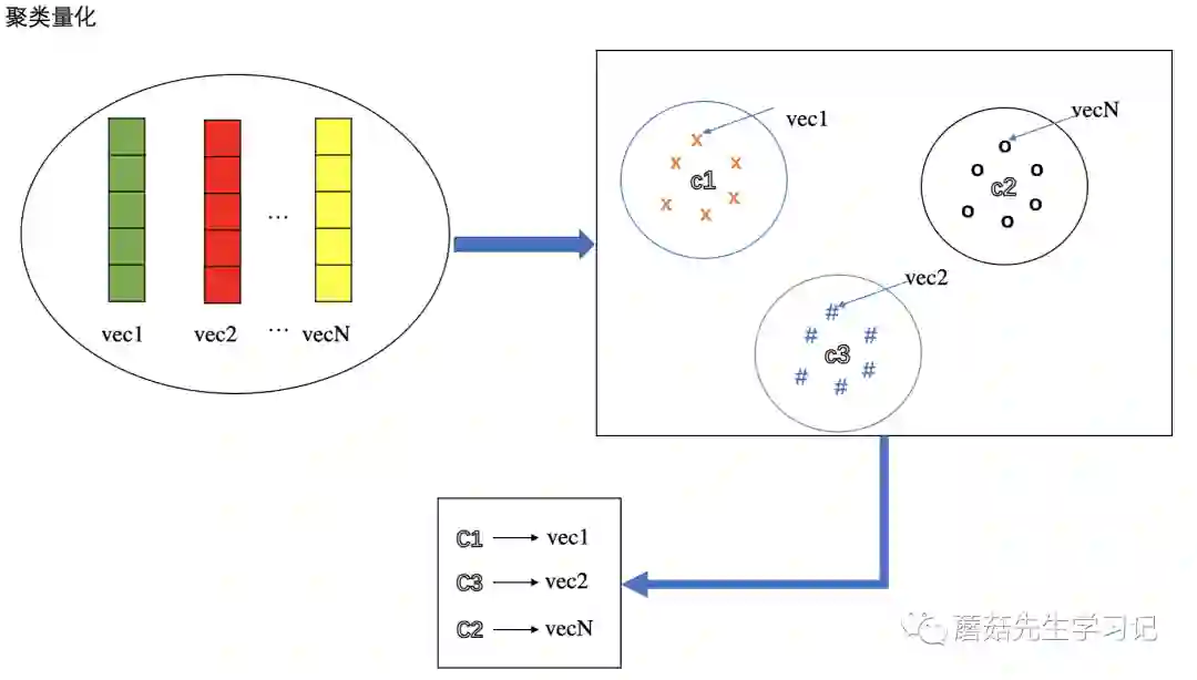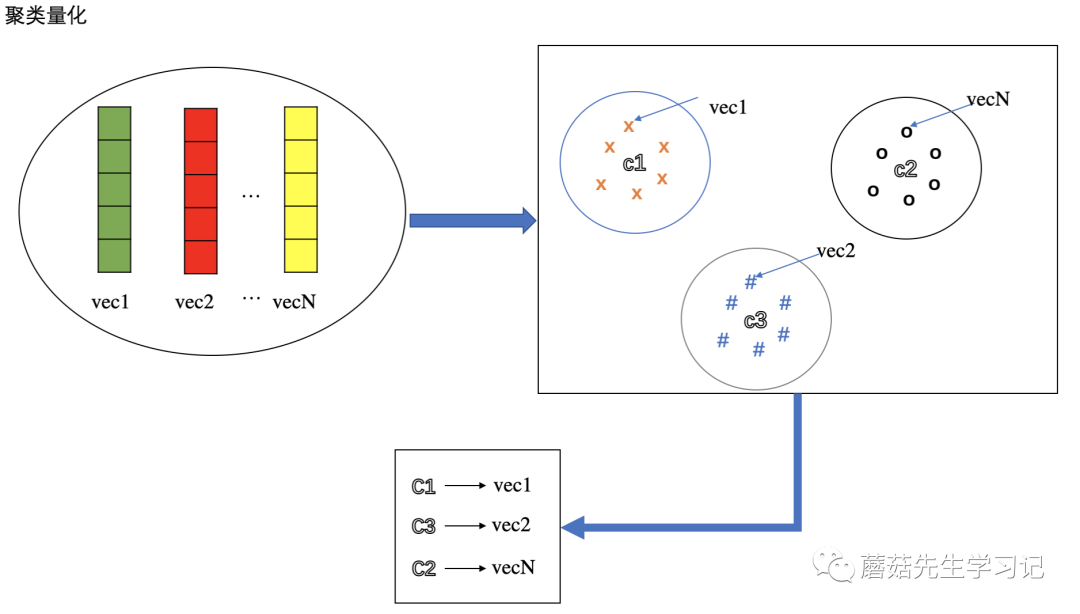 如上图所示,N个向量,通过聚类量化产生多个聚类中心,每个向量属于某个聚类簇中,那么就用该聚类簇对应的中心向量来量化该向量,可以用聚类簇中心对应的下标ID来表示,比如:C1量化vec1。