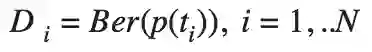 为了将温度 t 下的失效概率 p(t) 与我们观测的数据联系起来,我们可以使用带参数 p(t) 的伯努利随机变量。要注意的是,一般而言 Ber(p) 是随机变量,它的值为 1 的概率为 p,其它情况下都为 0。因此,生成模型的最后一部分是温度值为 𝑖 的情况下观测到的有缺陷事件的数量 D𝑖,我们可以对其建模为:
