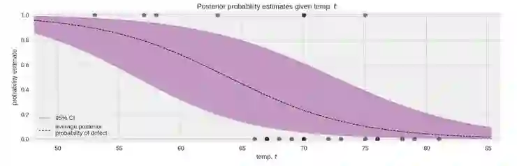 我们可以在整个温度范围内计算 95%的可信区间。要注意的是,这个区间是可靠的,而不是在统计分析的频率论方法中常用到的置信区间。95%可信区间告诉我们,能够以 95%的概率确定真实值将位于此区间内。例如,在正如下图中的紫色区域所显示的,在 50 度时,我们可以 95%确定 O 形圈损坏的概率介于 1.0 和 0.80 之间。讽刺地是,许多人都错误地将置信区间解释为具有这一特征。
